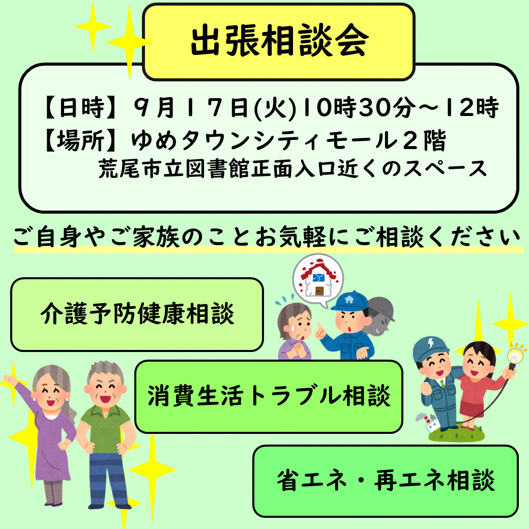 9月は、介護予防や消費生活トラブル、省エネ・再エネに関する相談を受け付けます。