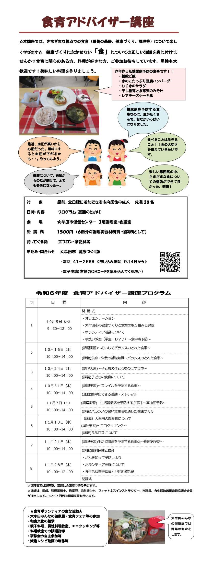食と健康づくりをテーマに、医師や管理栄養士などによる講話、調理実習、簡単にできる運動などを行ないます。「食」の知識を深めませんか?食育に関心のある方、料理が好きな方のご参加をお待ちしています。