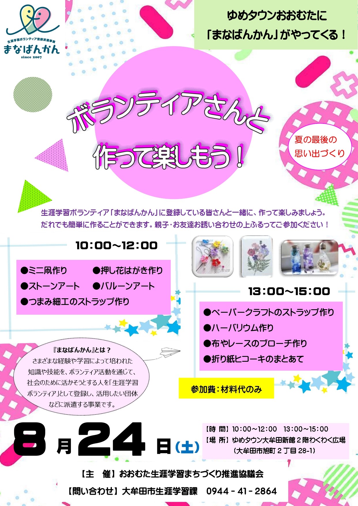 ゆめタウン大牟田で生涯学習ボランティア「まなばんかん」に登録している皆さんと一緒に、作って楽しみましょう。だれでも簡単に作ることができます。夏休みの思い出に親子・お友達お誘い合わせの上ふるってご参加ください。くわしくは、チラシをご覧ください。