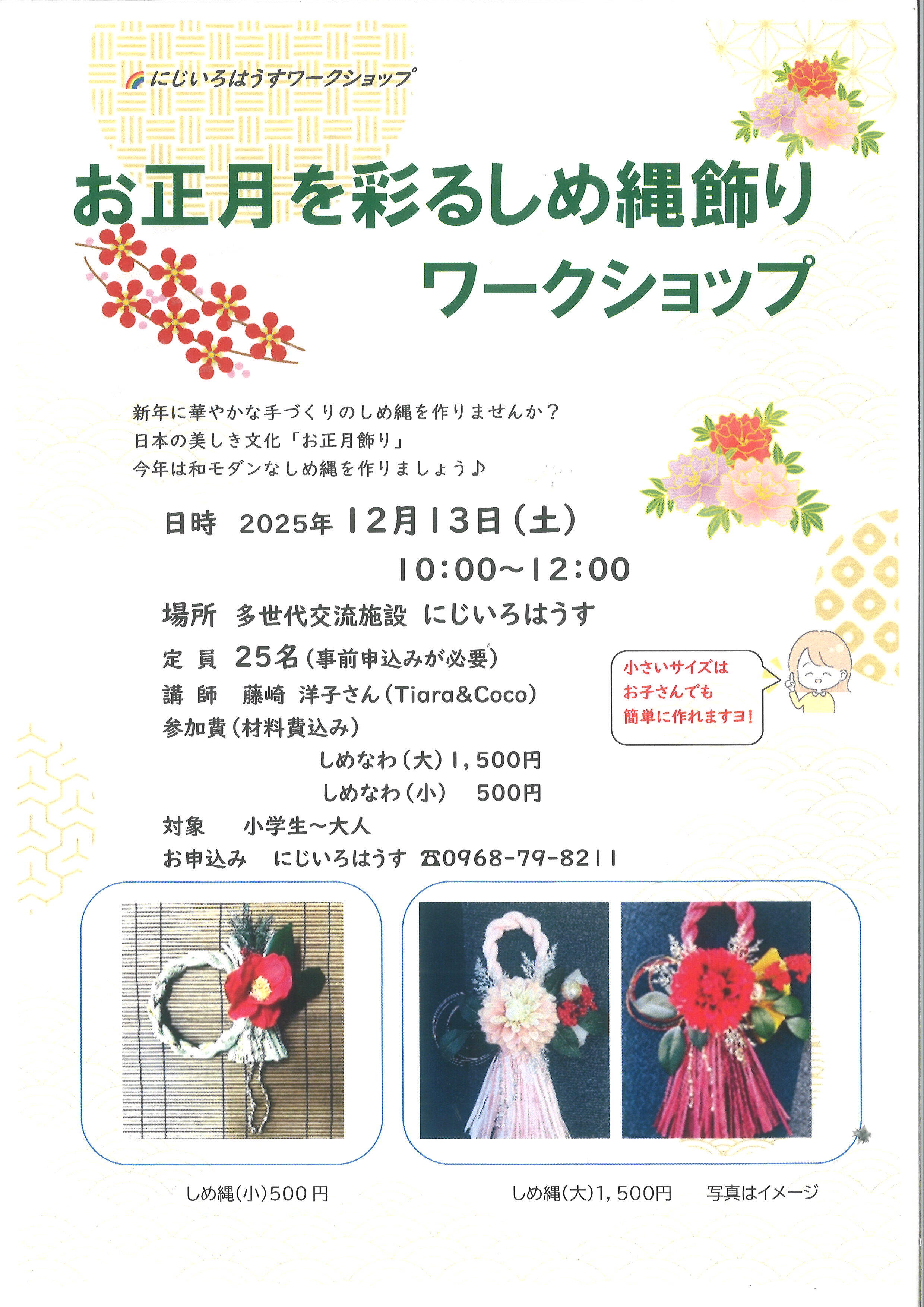 新年に華やかな手づくりのしめ縄を作って飾りませんか?みなさんのご参加お待ちしています。