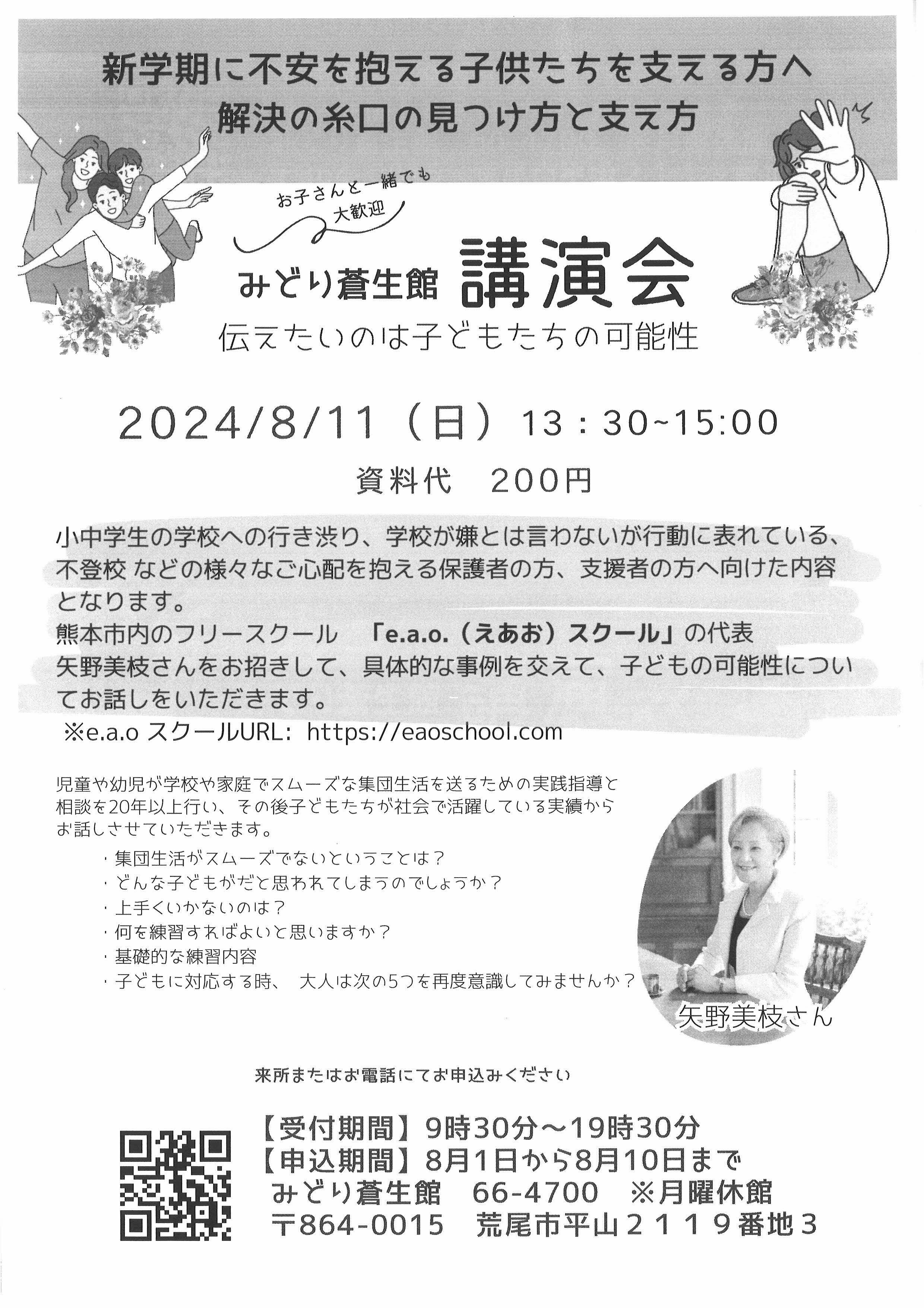 熊本市内のフリースクール「e.a.o(えあお)スクール」の代表「矢野美枝さん」をお招きして、具体的な事例を交えて、子どもの可能性についてお話しをしていただきます。