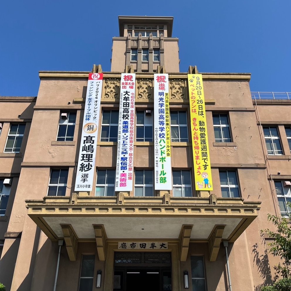 パリ2024オリンピックフェンシング女子サーブル団体髙嶋理紗選手の銅メダル獲得を祝して懸垂幕を設置しています