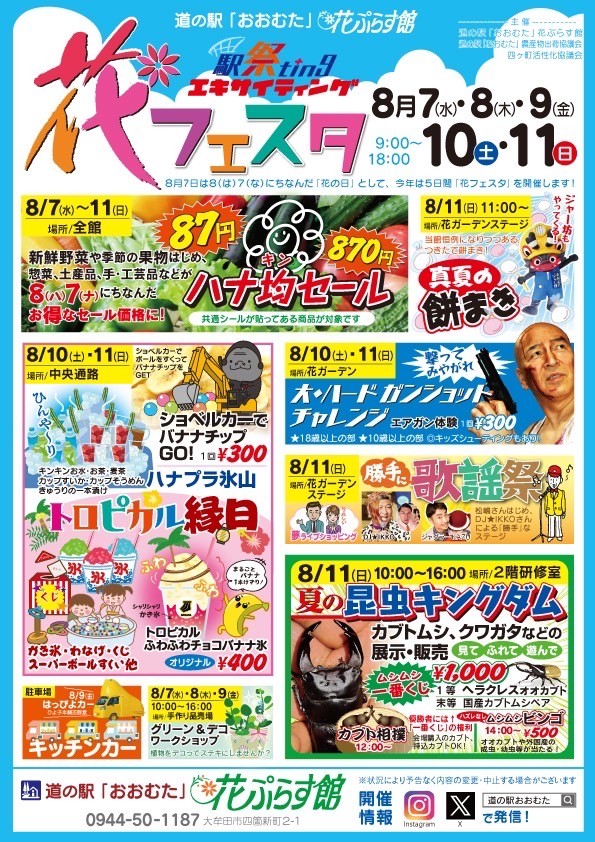 道の駅「おおむた」花ぷらす館では、8月7日の8(は)7(な)にちなんだ「花の日」として、8月7日(水)~8月11日(日)の5日間“花フェスタ”が開催されます!