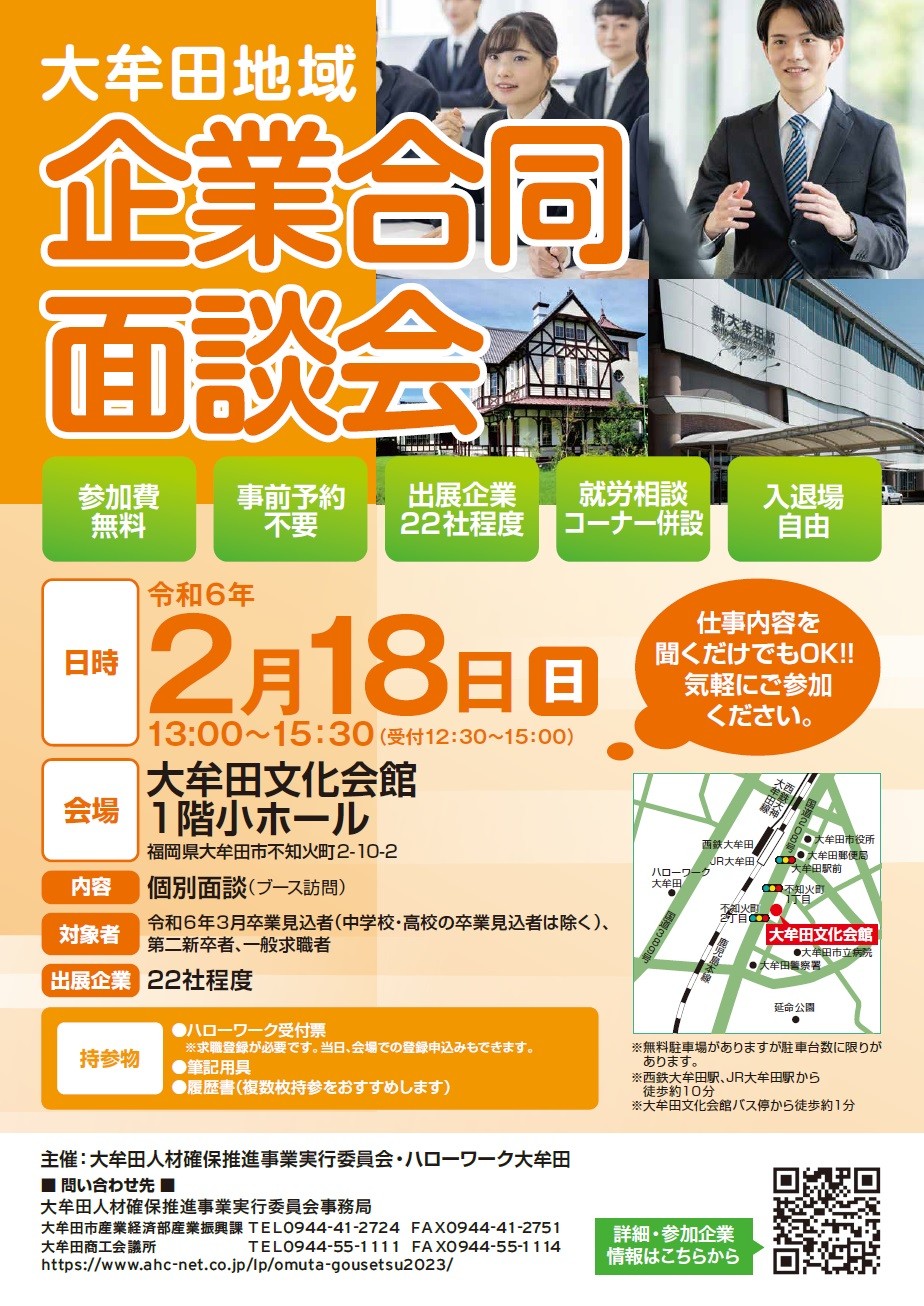 2月18日に大牟田地域企業合同面談会を開催します。事業所の採用担当者から事業内容や労働条件の説明を聞いたり、その場で面接を受けることができます。一度に多くの企業と出会えるチャンスです。多くのご参加、お待ちしています。