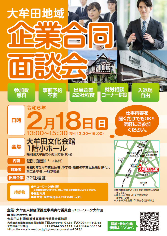 2月18日に大牟田地域企業合同面談会を開催します。事業所の採用担当者から事業内容や労働条件の説明を聞いたり、その場で面接を受けることができます。一度に多くの企業と出会えるチャンスです。多くのご参加、お待ちしています。