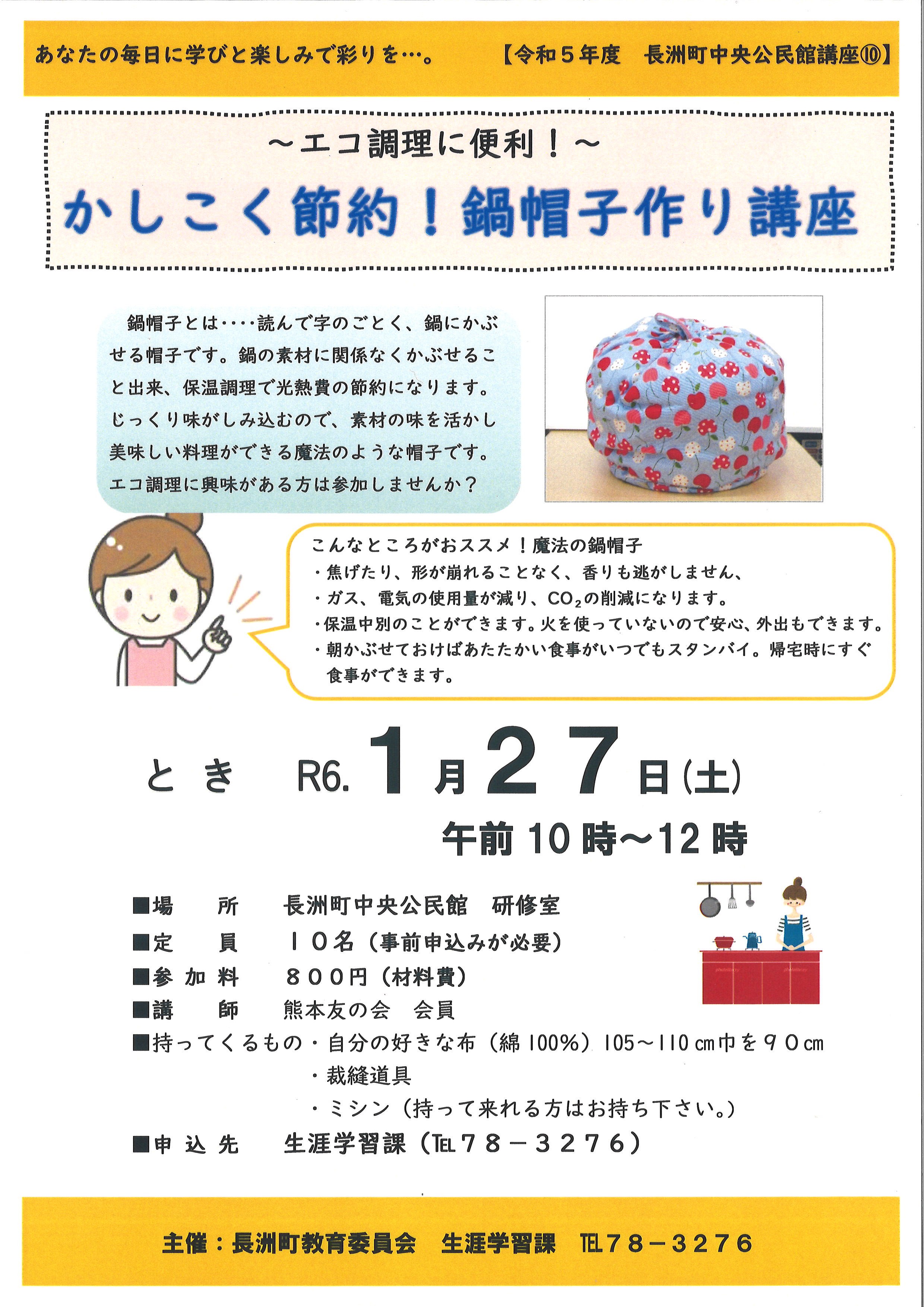 新年を迎え、あなたにもできる環境(エコ)生活を学びませんか。今回は、環境にやさしい生活についてのお話と鍋の素材に関係なく鍋にかぶせるだけで保温調理ができる鍋帽子を作ります。裁縫が苦手な方も、丁寧に完成までお手伝いしますので、お気軽にご参加ください。