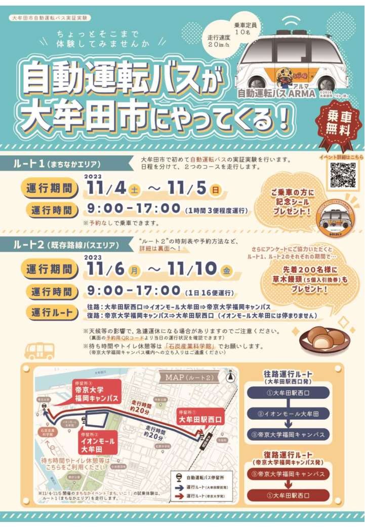 11月4日・5日の2日間で様々な団体が主催する複数のイベント「おおむた100円玉笑店街」や「大牟田二十日えびす」、「大牟田映画祭まちなかステージ」、市内学生による合同文化祭「Re Le Fes.」、「自動運転バス試乗体験」等を同時開催します!