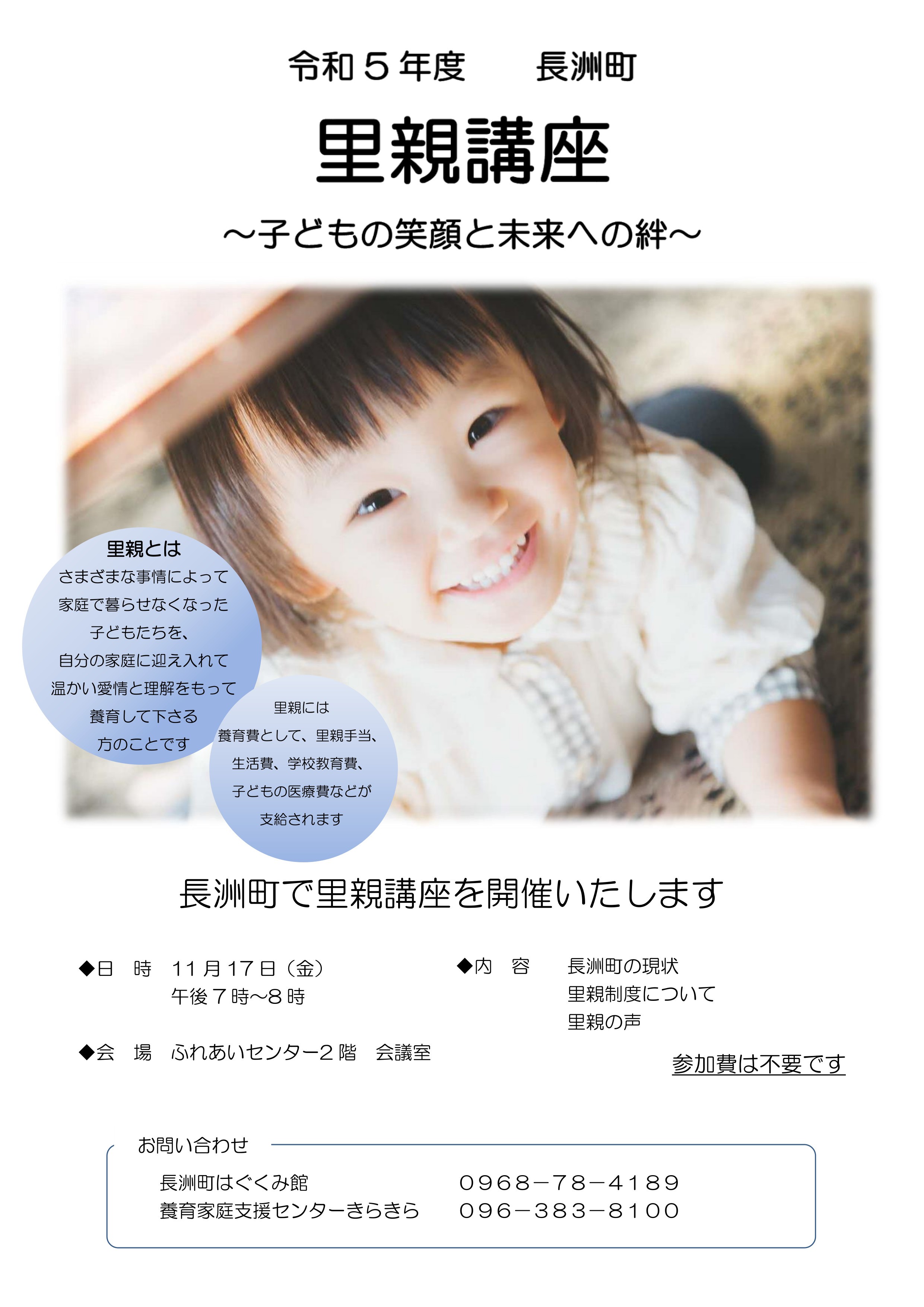 長洲町では、里親に関する理解を深めていただくため、次のとおり里親講座を開催します。