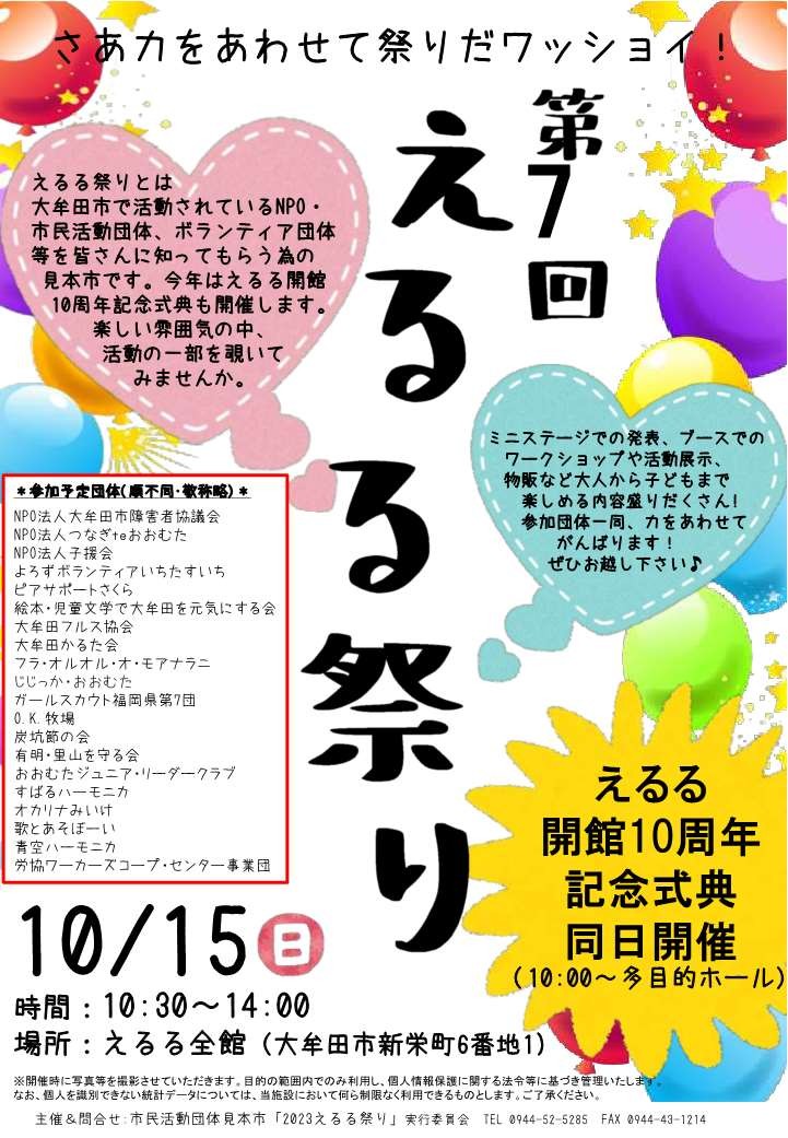 えるる祭りは、大牟田市内で活動されているNPO・市民活動団体、ボランティア団体等を、多くの皆さまに知っていただくための見本市です。今年はえるる開館10周年記念式典も開催します。