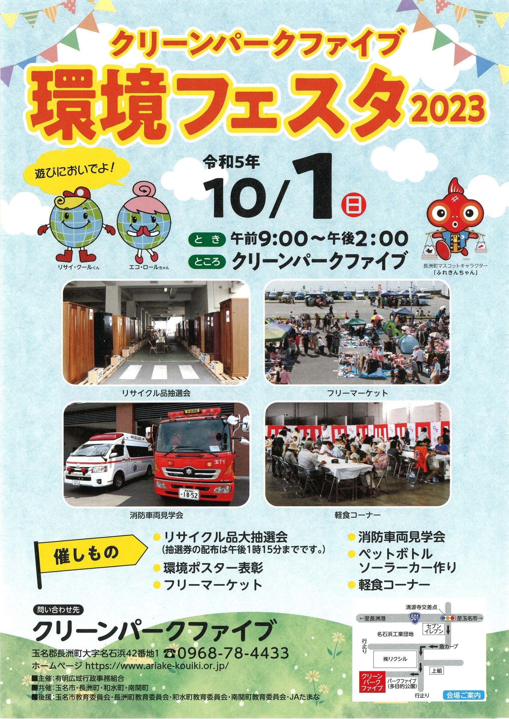 【催 し】環境ポスター表彰式、リサイクル品大抽選会、フリーマーケット、消防車両の見学、幼稚園児による演奏、ソーラーカー製作、軽食コーナーなど