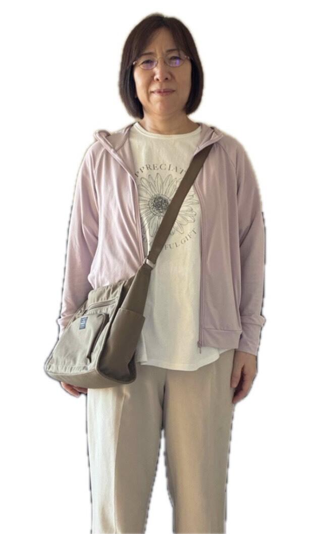 【服装】:薄いピンク系のパーカー、白色のTシャツ、ベージュ系のズボン、白色のスニーカー、茶色のバッグ(斜め掛け)、ヘルプカードを所持している、日傘を持っている、眼鏡あり