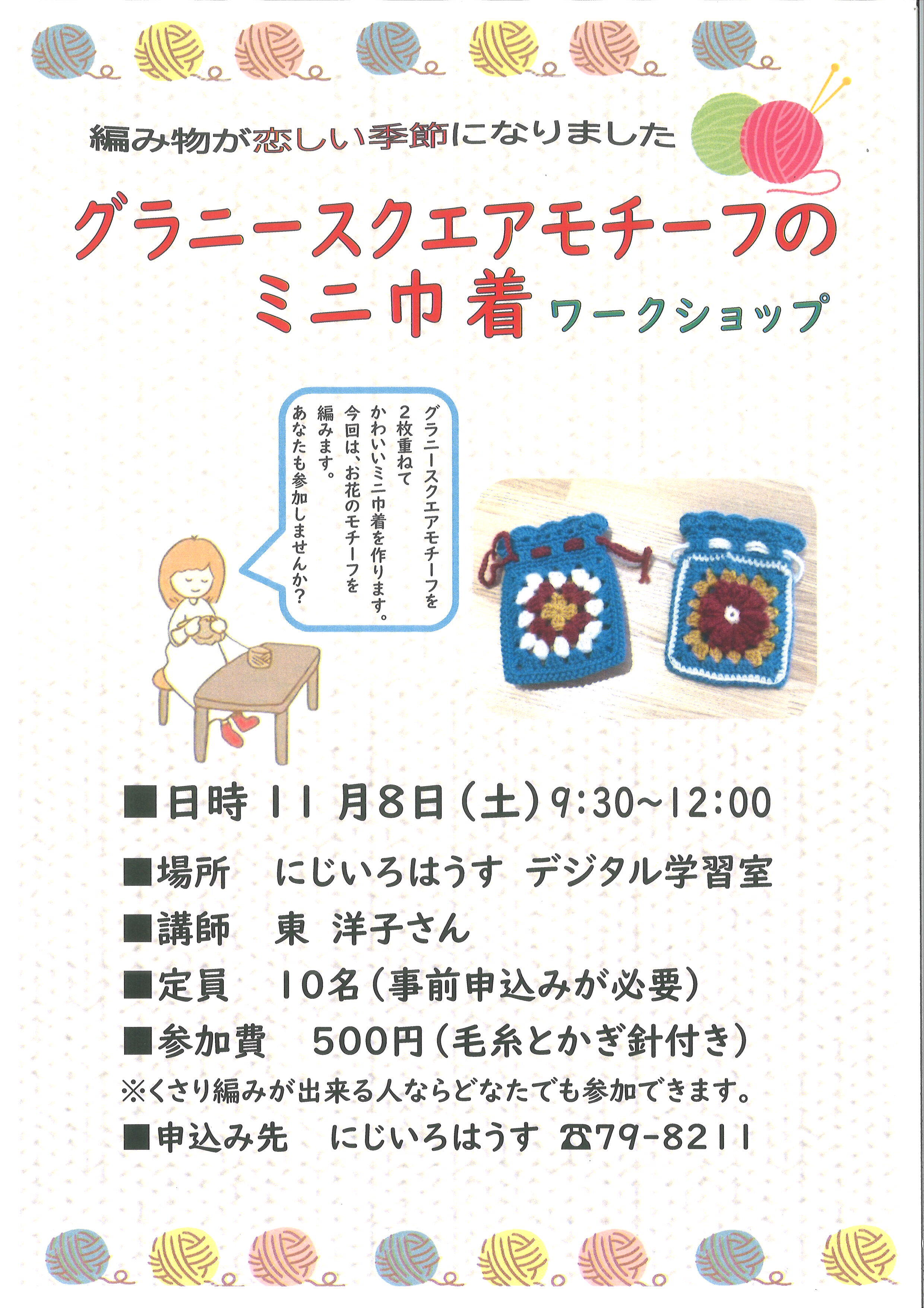 《参加者募集!》「グラニースクエアモチーフのミニ巾着」ワークショップ