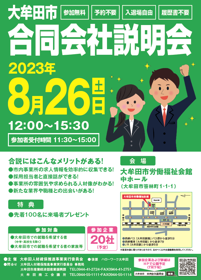 8月26日に大牟田市合同会社説明会を開催します。一度に多くの事業所の仕事内容や、労働条件などの説明を聞くことができます。また、先着100名に来場者プレゼントもあります!
