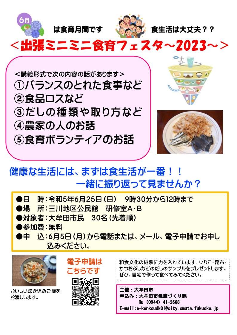 6月は食育月間です。食育について、楽しく学びませんか?食育月間行事の1つとして、出張ミニミニ食育フェスタ~2023~を開催します。様々な講座(座学形式)があります。皆さんのご参加をお待ちしています。