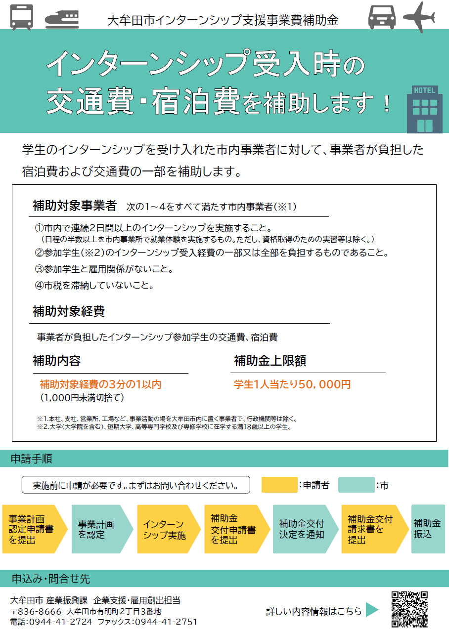 大牟田市では市内事業者が行うインターンシップを支援することにより、学生の市内事業者に対する理解を促進し、もって事業者の人材確保が図れるよう、インターンシップの受入に要する経費の一部を補助する制度を創設しました。