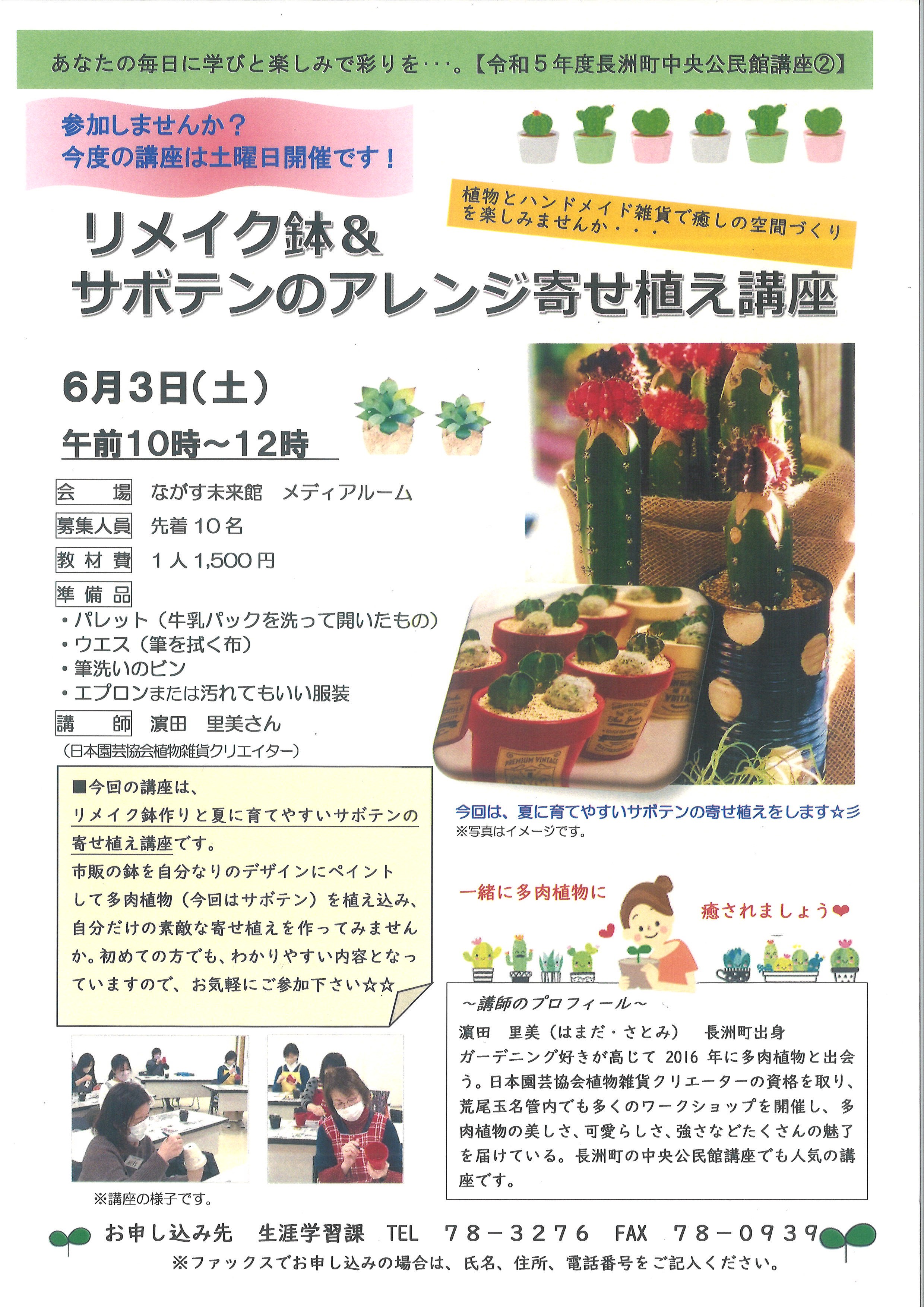 公民館講座でも人気の多肉植物の寄せ植え講座。今回は「リメイク鉢&サボテンの寄せ植え講座」を開催します。市販の鉢を自分でリメイクし、今ブームの多肉植物の中でも夏に育てやすいサボテンの寄せ植えをします。土曜日開催なので、親子での参加もできます。あなたも参加してみませんか?