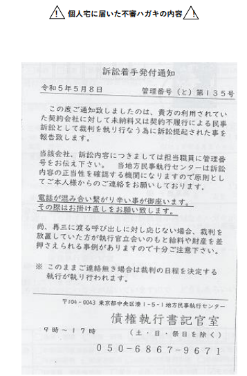 5月11日、大牟田市正山町の個人宅宛に、身に覚えのない訴訟等に関する不審なハガキが送られてくる事案が発生しました。ハガキには「未納料又は契約不履行による民事訴訟が提起された」等と、不安を煽る内容が記載されていました。