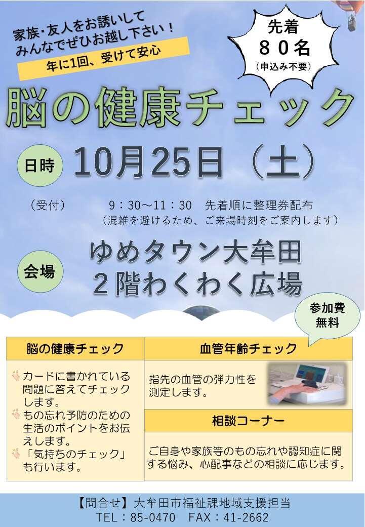 10月25日(土)ゆめタウンで『脳の健康チェック』を開催します