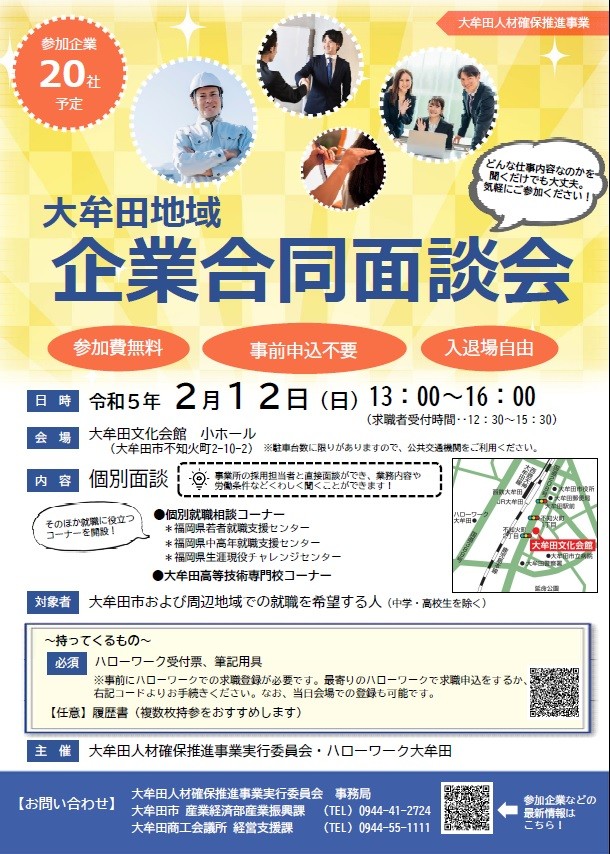 2月12日に大牟田地域企業合同面談会を開催します。一度に多くの会社の仕事内容や、労働条件などの説明を聞くことができます。また、その場で面接を受けることも可能です。