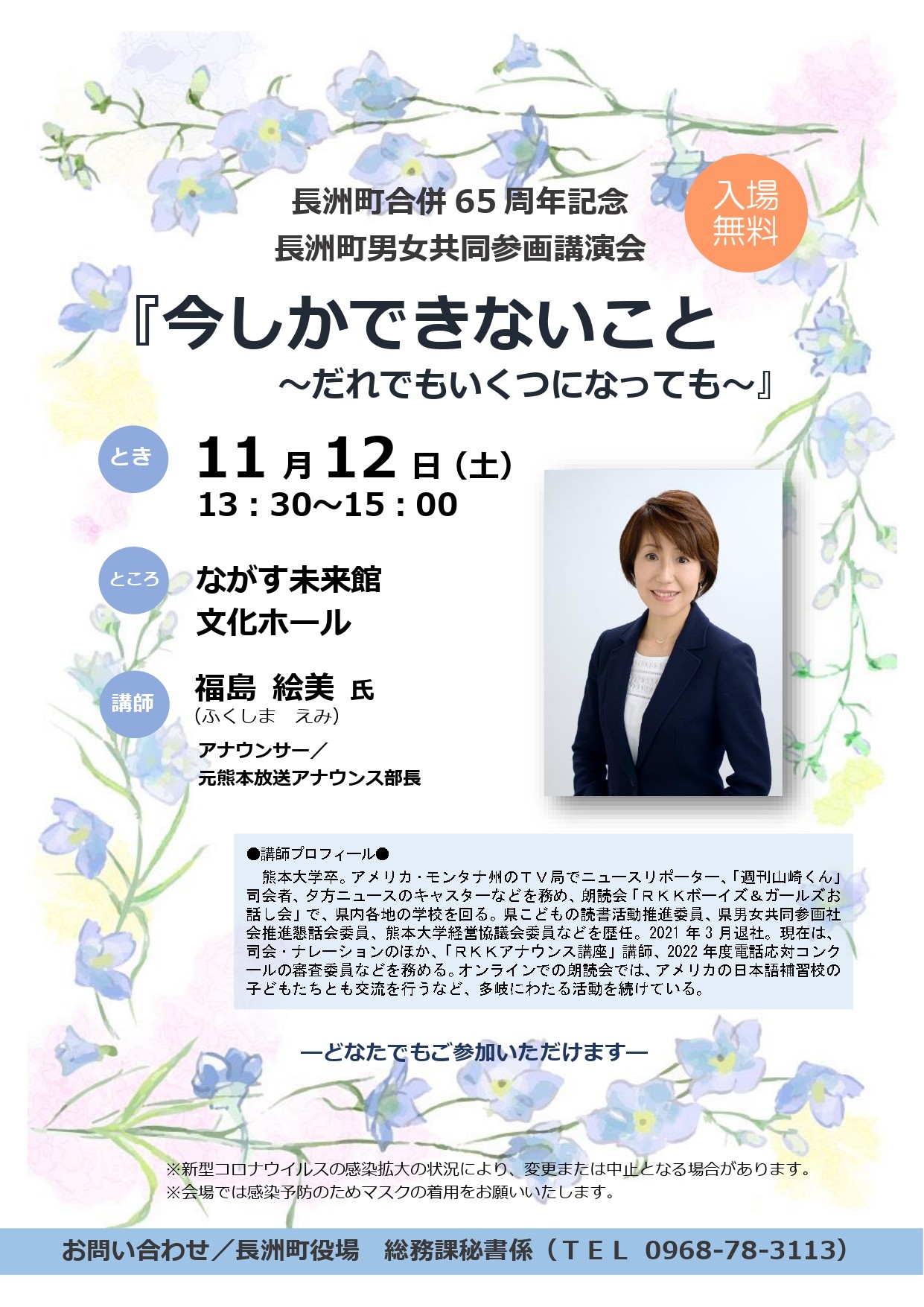 【長洲町】今週11月12日(土)開催!合併65周年記念事業「男女共同参画講演会」