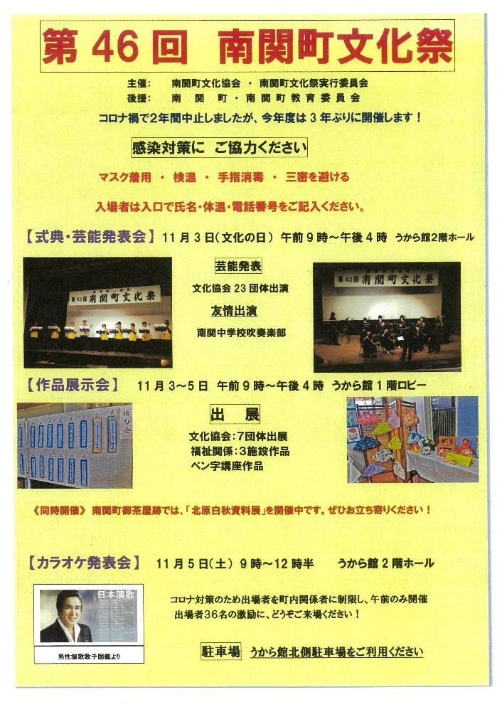 第46回南関町文化祭を11月3日(木)~5日(土)まで南の関うから館で開催します。内容は下記のとおりです。