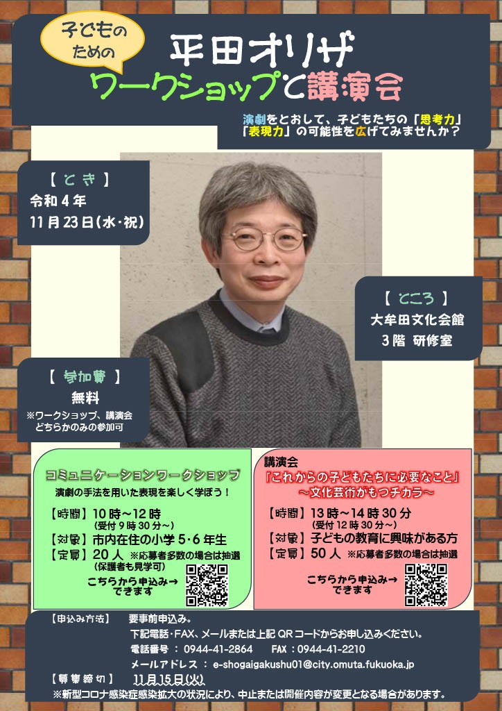 平田オリザ氏による子どものためのワークショップ&講演会 開催のお知らせ