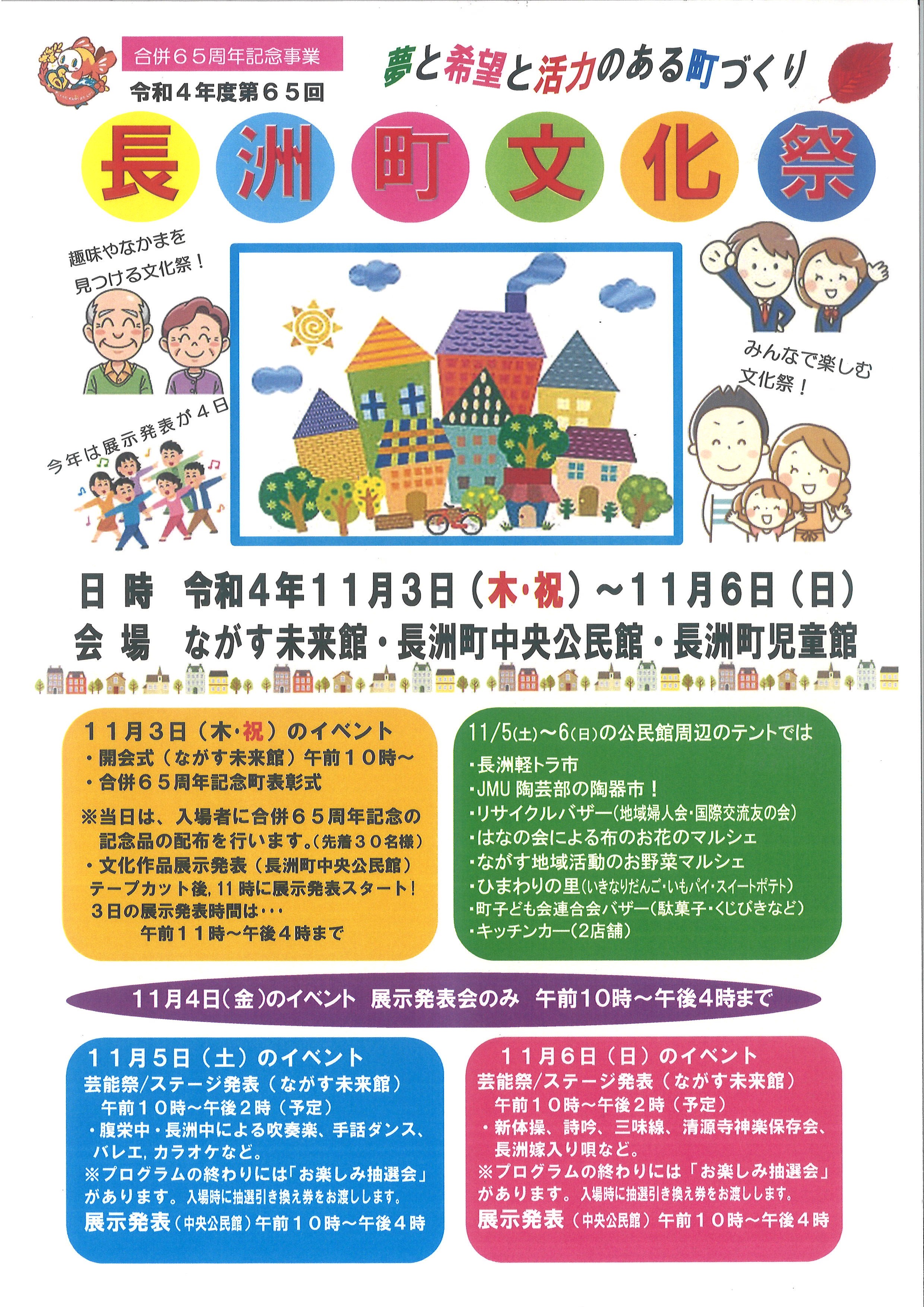 合併65周年記念事業令和4年度第65回長洲町文化祭を開催します!