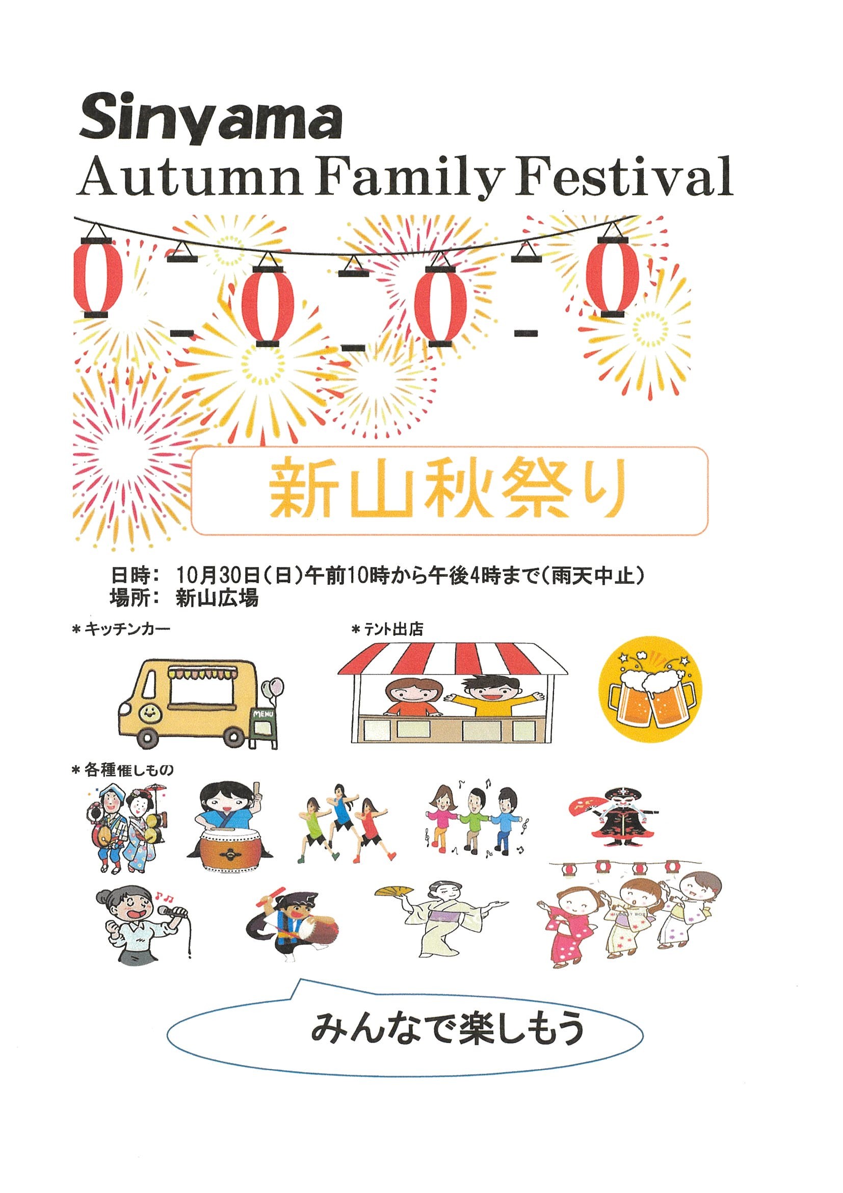 10月30日、新山区自治会では、4年ぶりとなる秋祭りを開催いたします。爆竹とチンドン屋によるオープニング、キッズストリートダンス、ラムネ早飲み競争、ビール早飲み競争、カラオケ大会など、子どもから大人まで楽しめる内容となっております。どなたでも参加できますので、ぜひご来場ください。