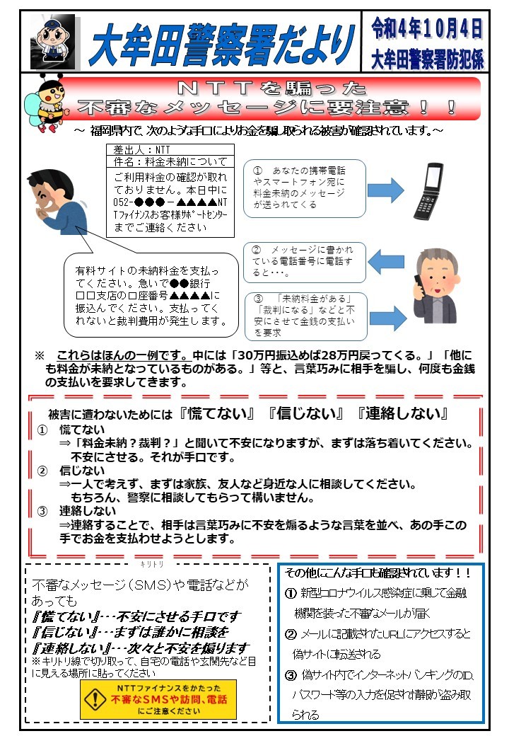 9月下旬ころから大牟田市内において、NTTを騙った不審なメールが届き、記載された番号に電話をすると未払い料金を請求されるという事案が連続して発生しています。