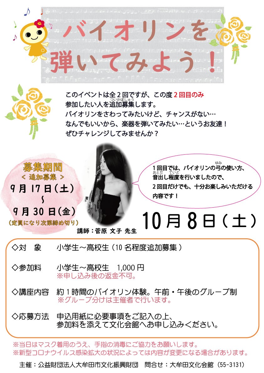 【大牟田文化会館】文化体験講座「バイオリンを弾いてみよう!」参加者追加募集♪
