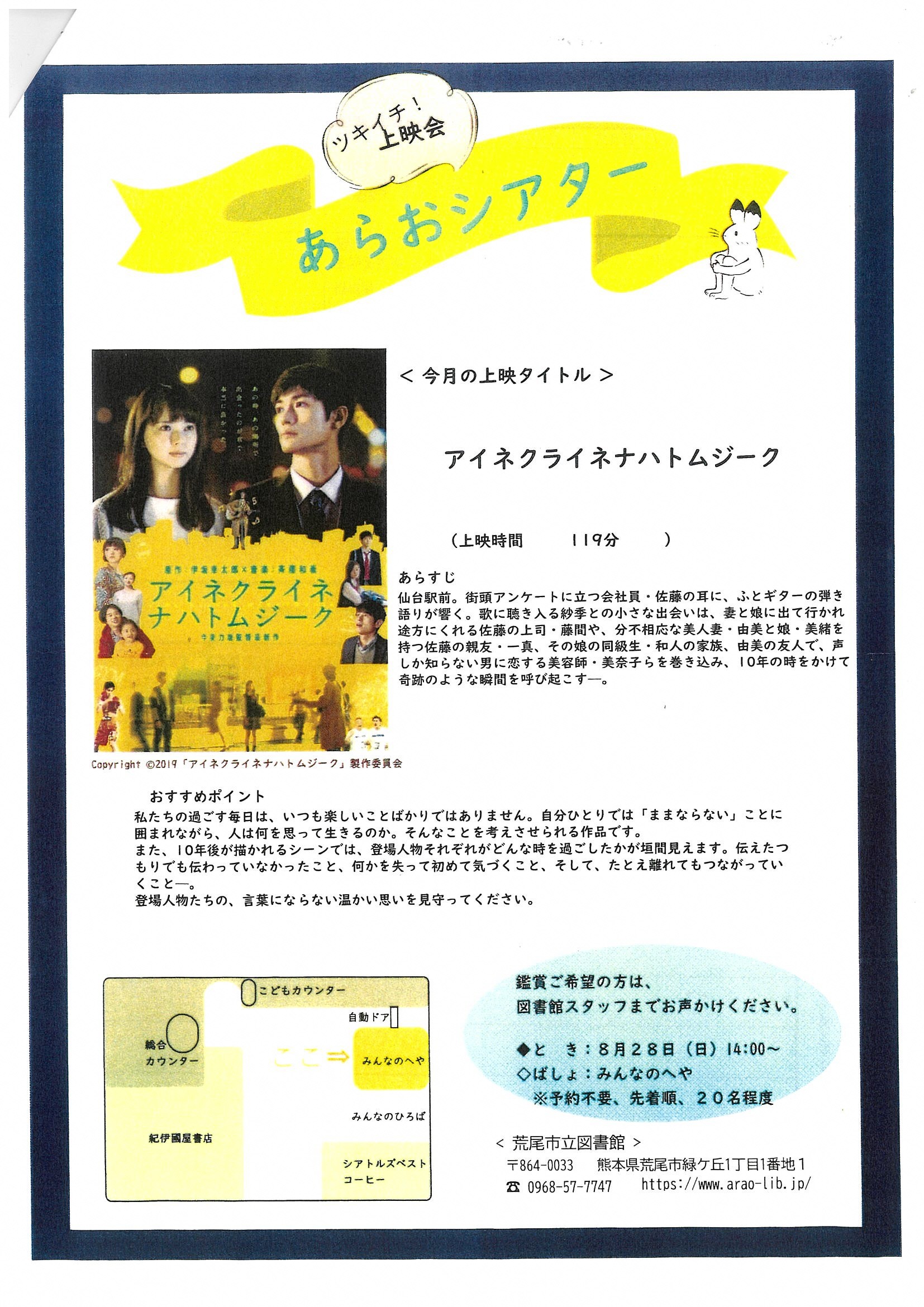 荒尾市立図書館では、毎月上映会を開催予定してます。上映スケジュールは、図書館内及びホームページでご確認ください。