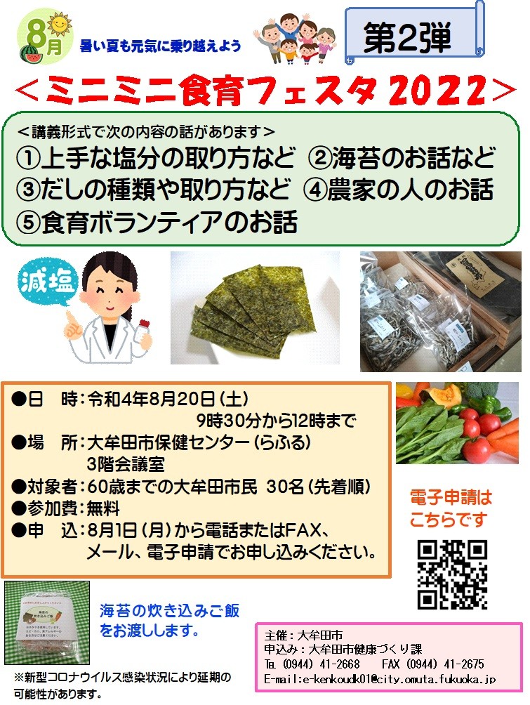 食育普及啓発事業の1つとして、ミニミニ食育フェスタ2022~第2弾~を開催します。様々な講話(座学形式)があります。この機会に食生活を見直してみませんか。皆さんのご参加をお待ちしています。