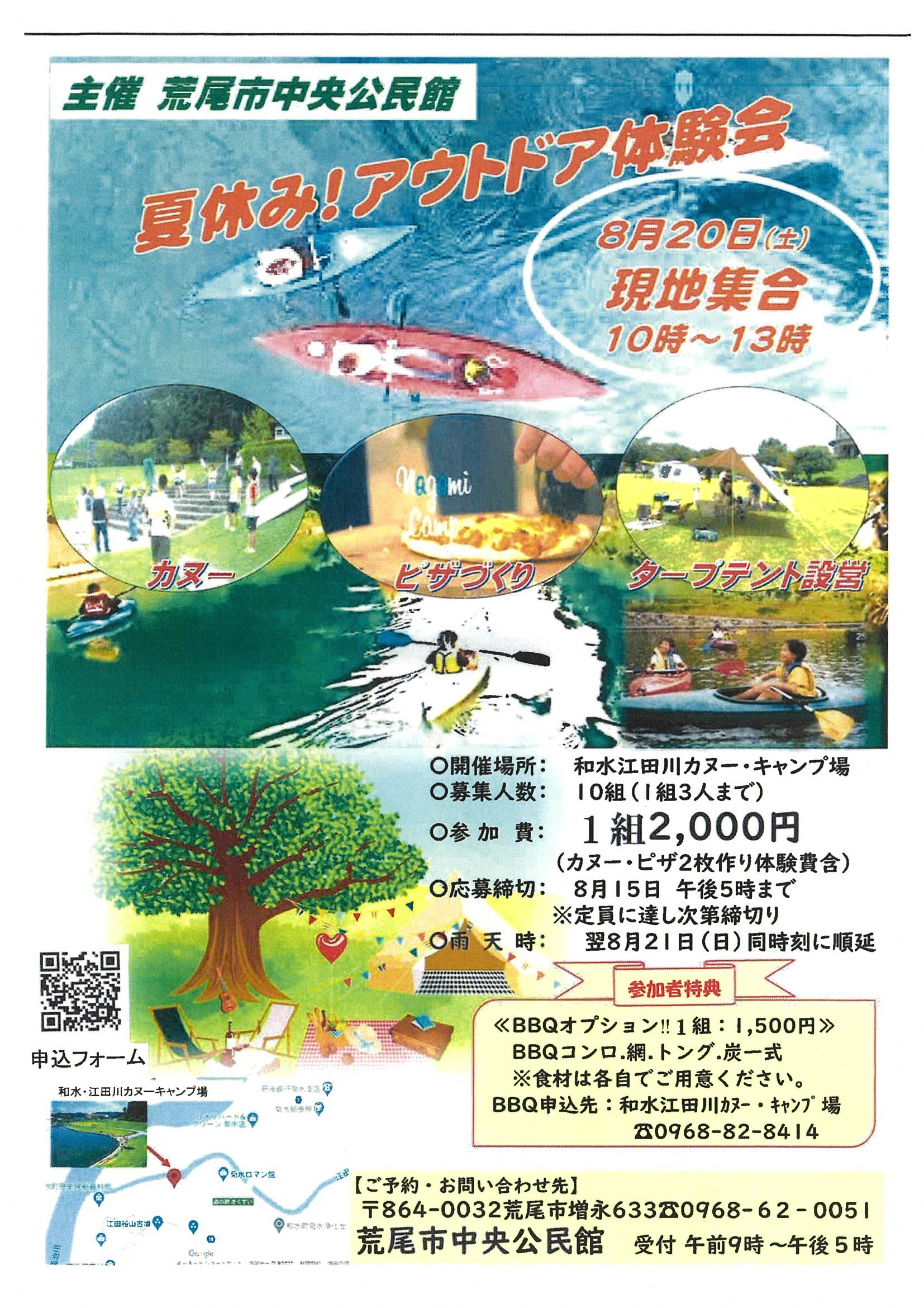 カヌーやピザづくりなどのアウトドア体験で、夏の思い出を作りませんか。家族やお友達をお誘いの上、ぜひご参加ください。