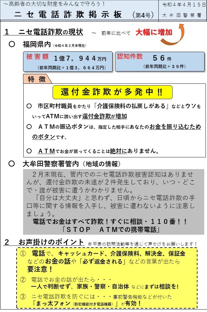 福岡県内では、高齢者を狙った「還付金詐欺」が多発しています。