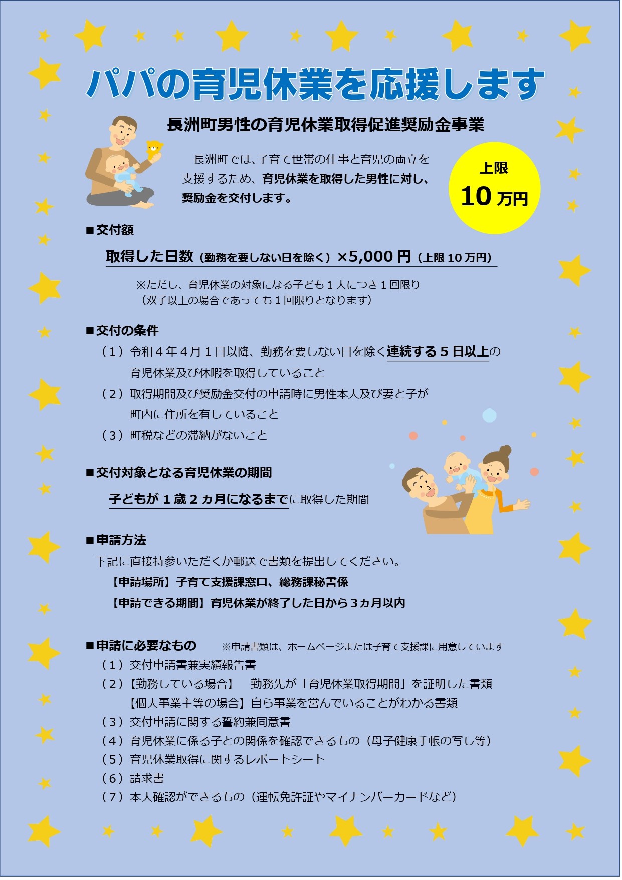 【長洲町】パパの育児休業を応援します~男性の育児休業取得促進奨励金事業~