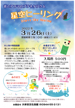 春ならではの桜のアロマとともに、星座にまつわる神話や名画をBGMに乗せて紹介します。来場者には香り付きしおりやスタンプなどの特典あり。