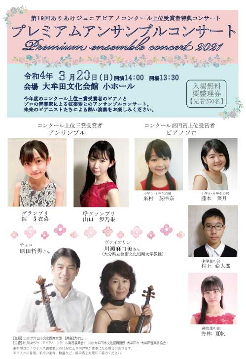 昨年行われた「第19回ありあけジュニアピアノコンクール」にて、グランプリ・準グランプリを受賞した2名とプロの音楽家たちによるアンサンブルコンサートを開催します。