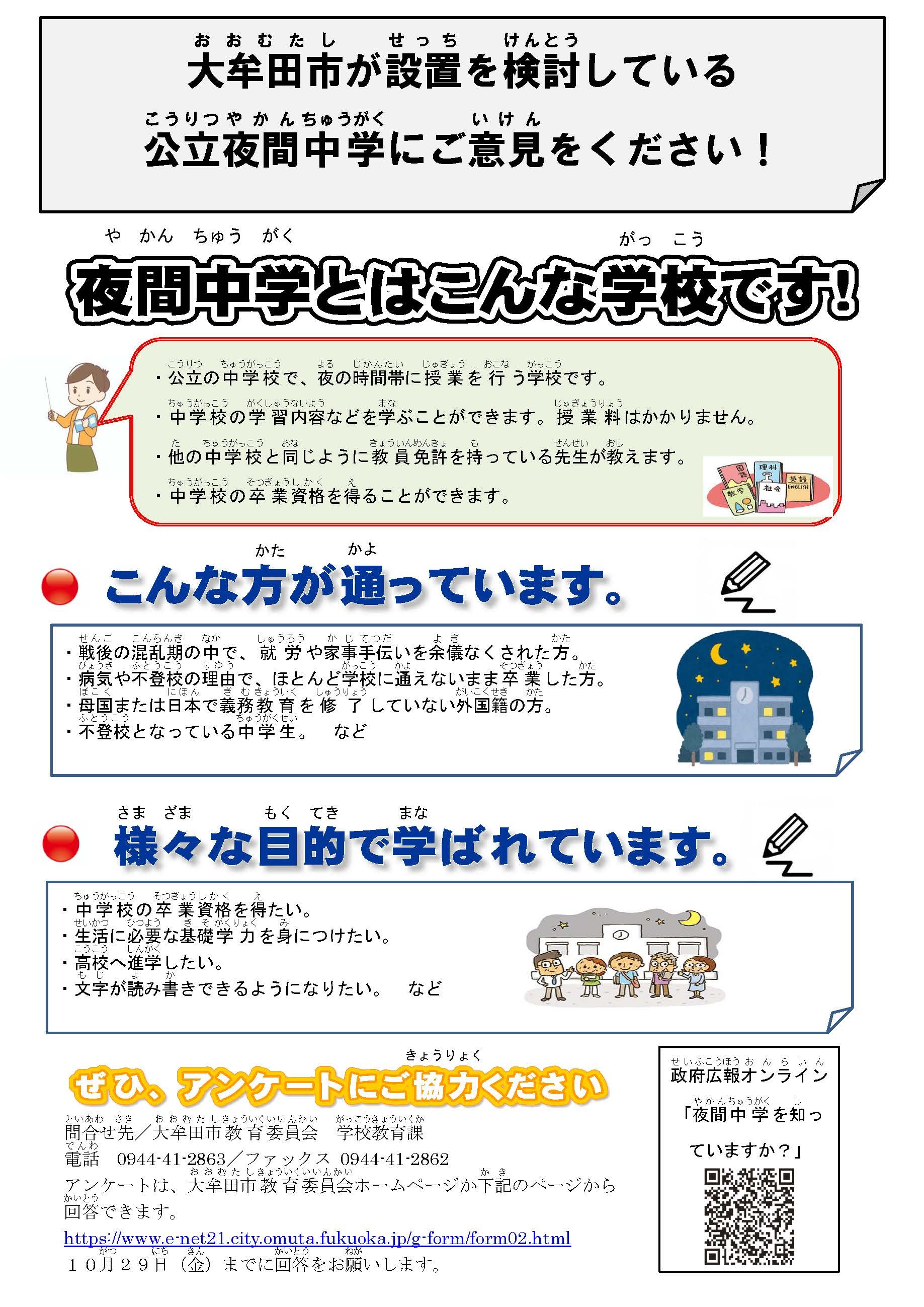 大牟田市教育委員会ホームページの「夜間中学を検討するアンケート」からご回答ください。