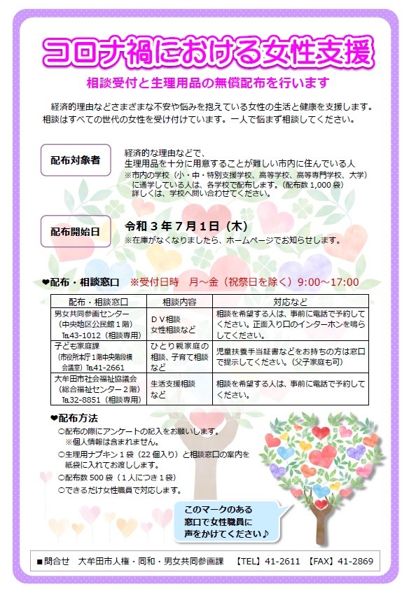 【配布中】コロナ禍における女性支援 ~相談受付と生理用品の無償配布を行います~