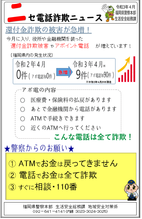 県内で、役所や金融機関を装った還付金詐欺やアポイント電話が急増しています。