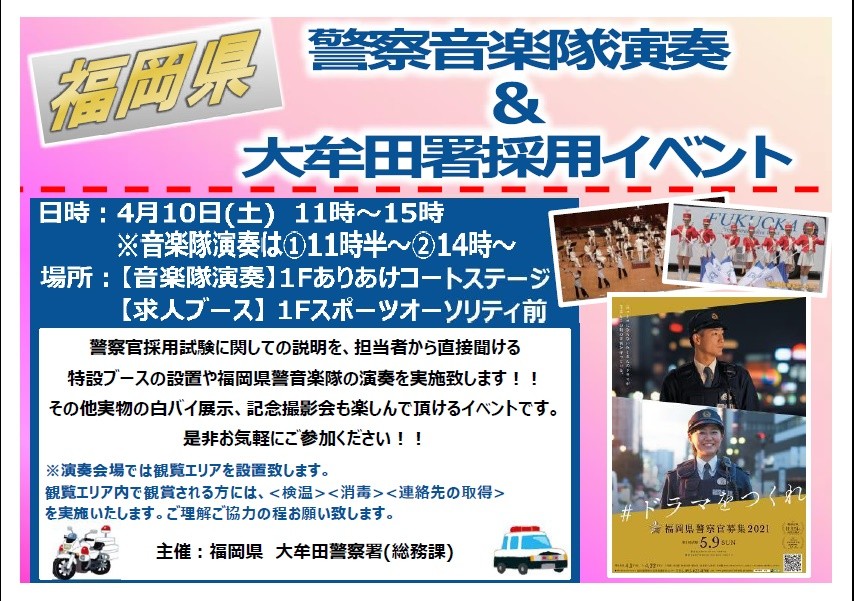 4月10日土曜日の午前11時00分~午後3時00分の間、イオンモール大牟田ありあけコートにおいて、警察官採用試験の説明会などを行います。