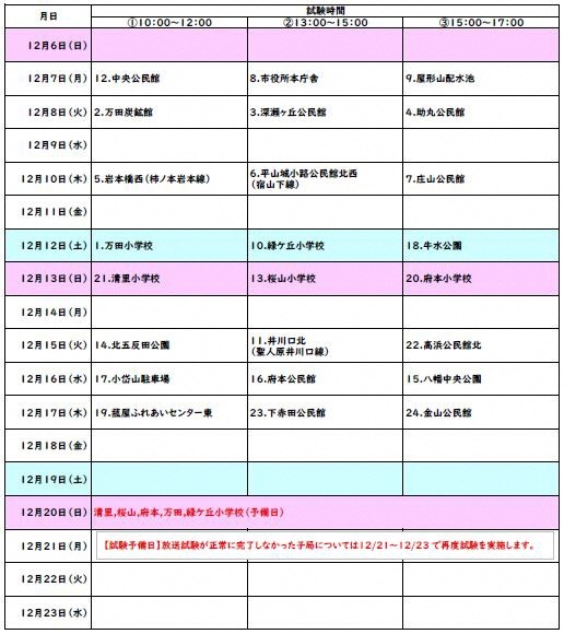 12月7日(月曜)から12月17日(木曜)の間(予備日:12月20日~23日)に1日3カ所を目安として、市内24箇所すべての地区で実施いたします。実施概要やスケジュール等につきまして、荒尾市ホームページをご確認いただき、試験当日におきましては、ご理解・ご協力いただきますよう、お願いいたします。