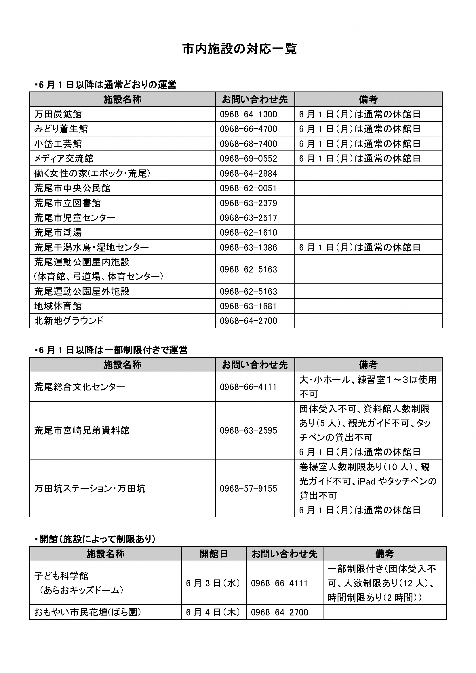 ただし、一部の施設(総合文化センターおよび子ども科学館(℡0968-66-4111)、宮崎兄弟資料館(℡0968-63-2595)、万田坑(℡0968-57-9155))については利用人数などについての制限がありますので、詳しくはホームページでご確認いただくか、直接お問い合わせください。