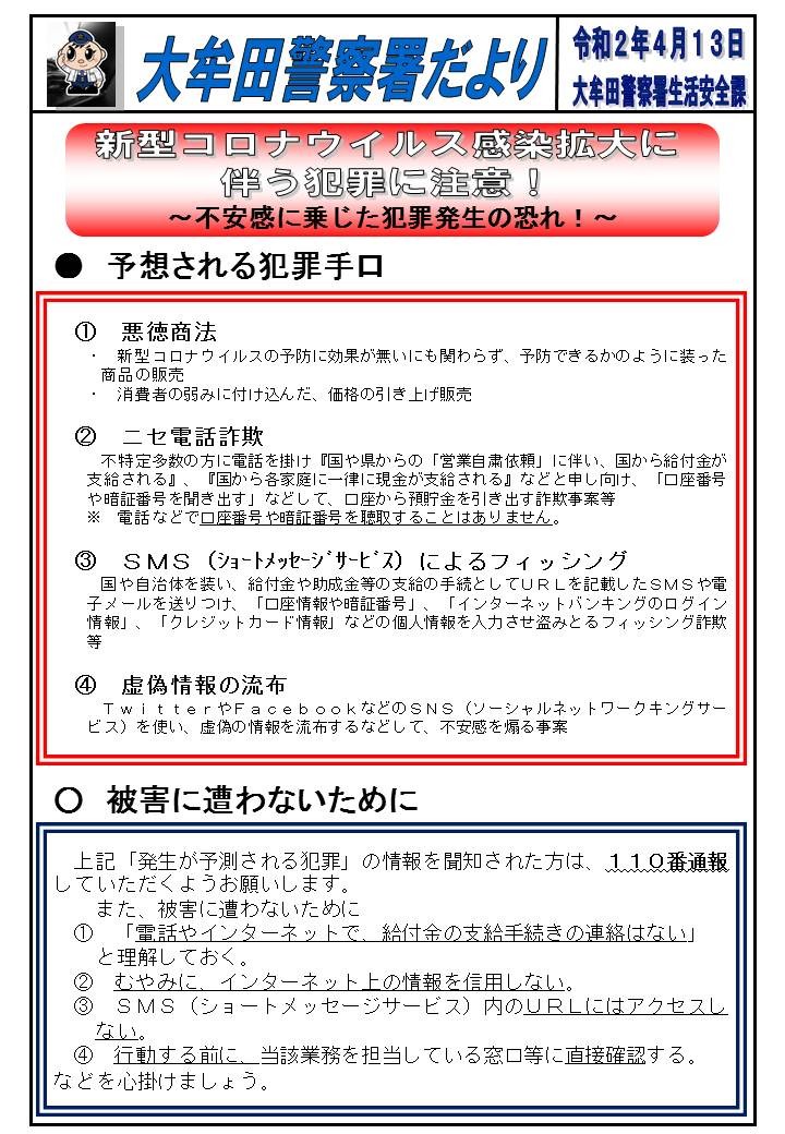 コロナウイルスの感染拡大に乗じた不審な電話が全国で確認され、他県では「コロナの給付金が支給されます。」という言葉にだまされた詐欺事件も発生しています。