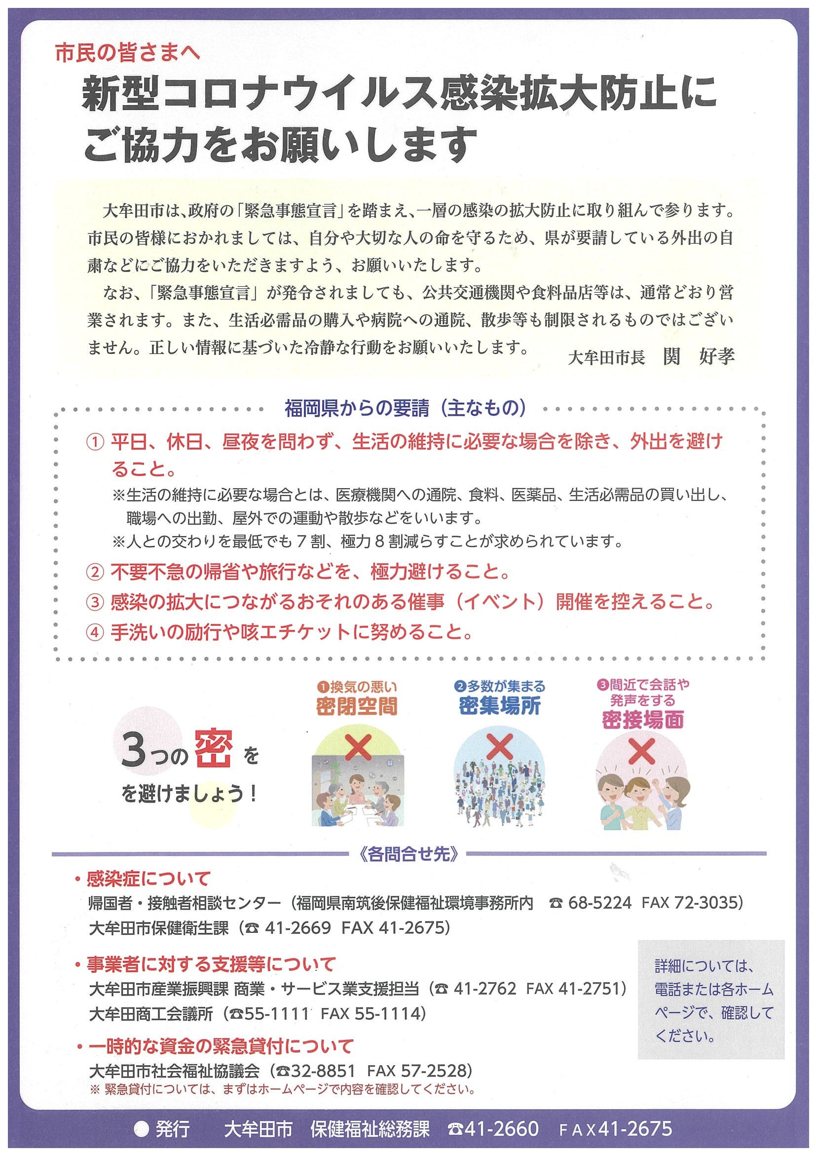 現在のところ、大牟田市内で感染は確認されていませんが、それに安心することなく、一人ひとりが感染拡大の防止につながるような行動をとっていきましょう。