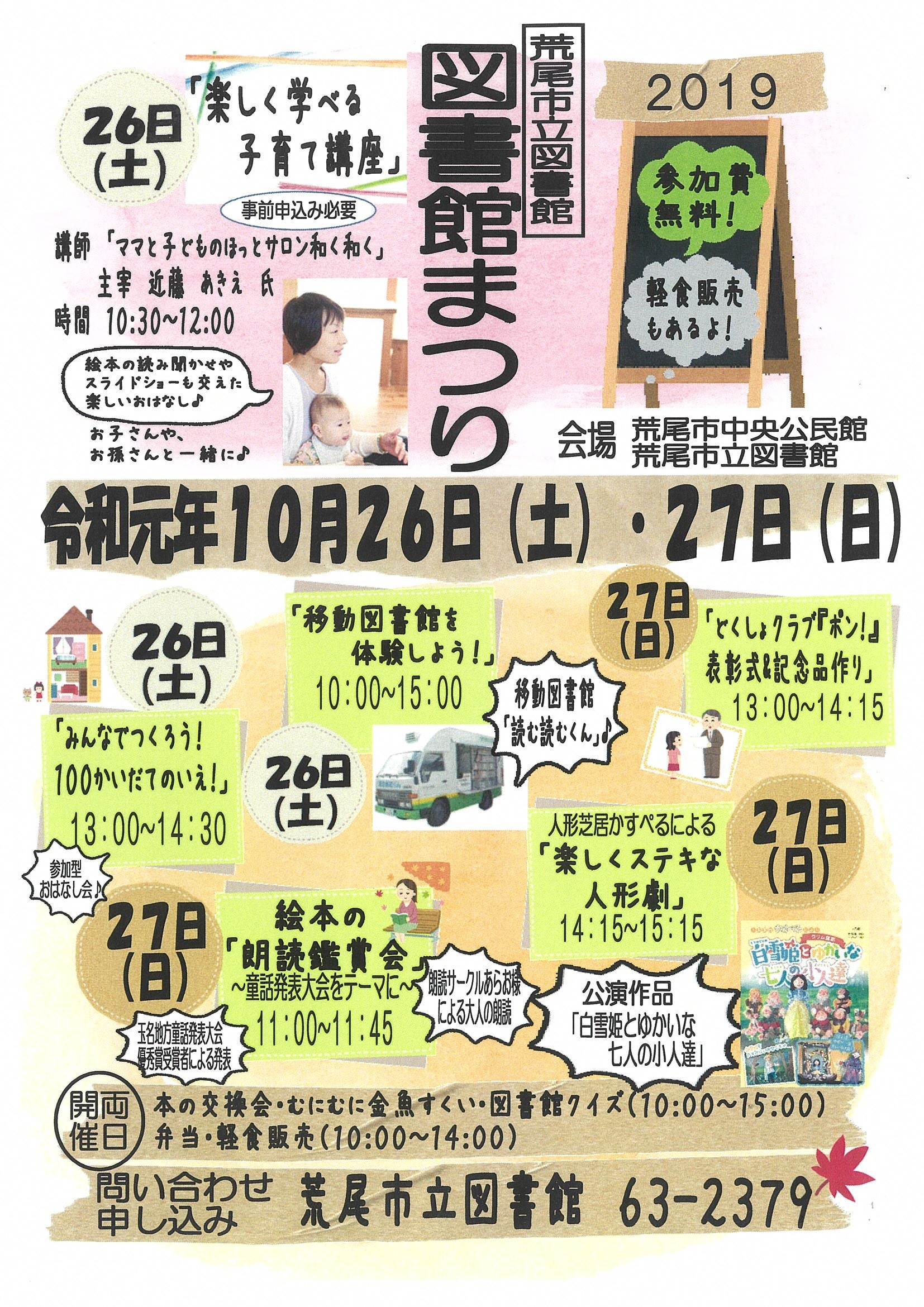 「読書の町 あらお」をスローガンに、下記の日程で今年も図書館まつりを開催します。