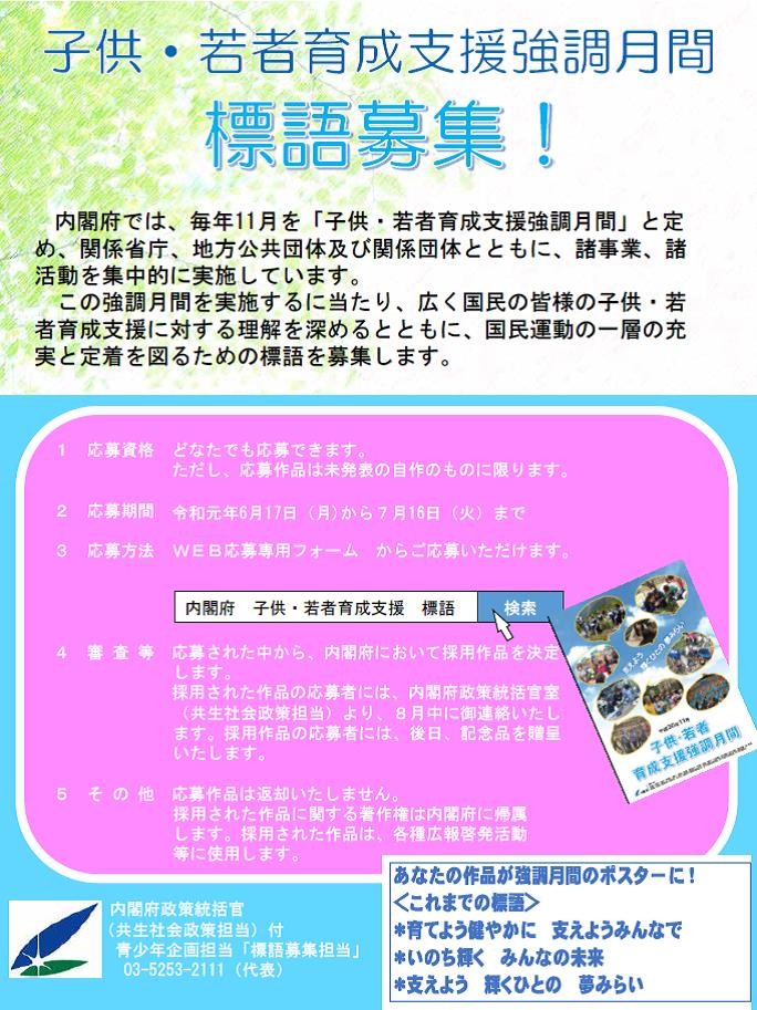 内閣府では、毎月11月を「子供・若者育成支援強調月間」と定め、関係省庁、地方公共団体及び関係団体ともに、諸事業、諸活動を集中的に実施しています。この強調月間を実施するに当たり、広く国民の皆様の子供・若者育成支援に対する理解を深めるとともに、国民運動の一層の充実と定着を図るための標語を募集します。