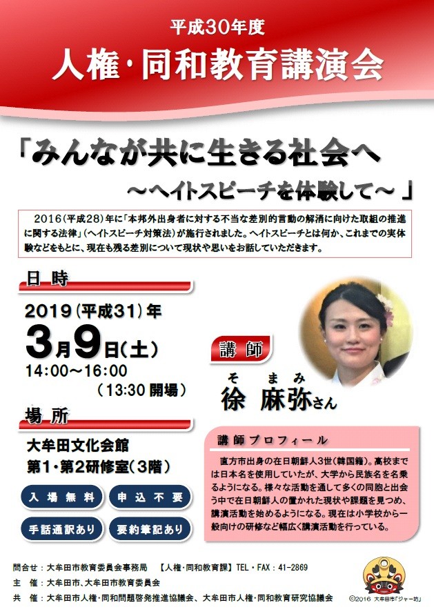 今回の平成30年度 人権・同和教育講演会のテーマは、「みんなが共に生きる社会へ~ヘイトスピーチを体験して~」です。多くの皆さまのご参加をお待ちしております。