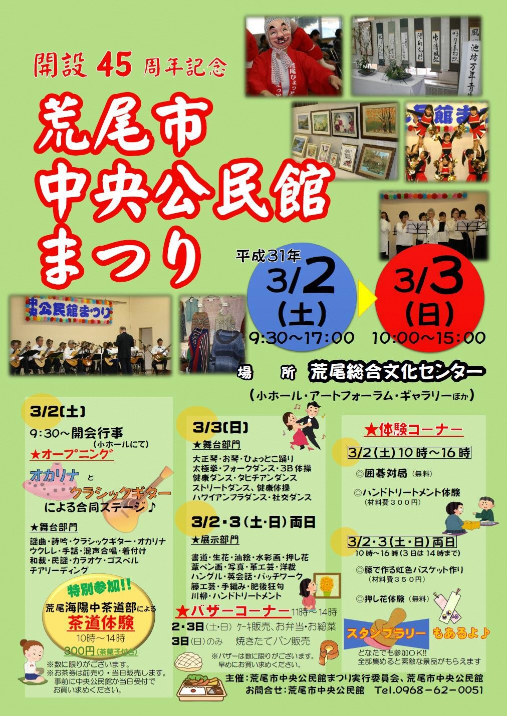 中央公民館開設45周年を記念して、文化センターを会場に「開設45周年記念中央公民館まつり」を開催します。中央公民館で学習している各講座・自主グループの皆さんが、1年間の成果を発表する楽しくにぎやかなお祭りです。