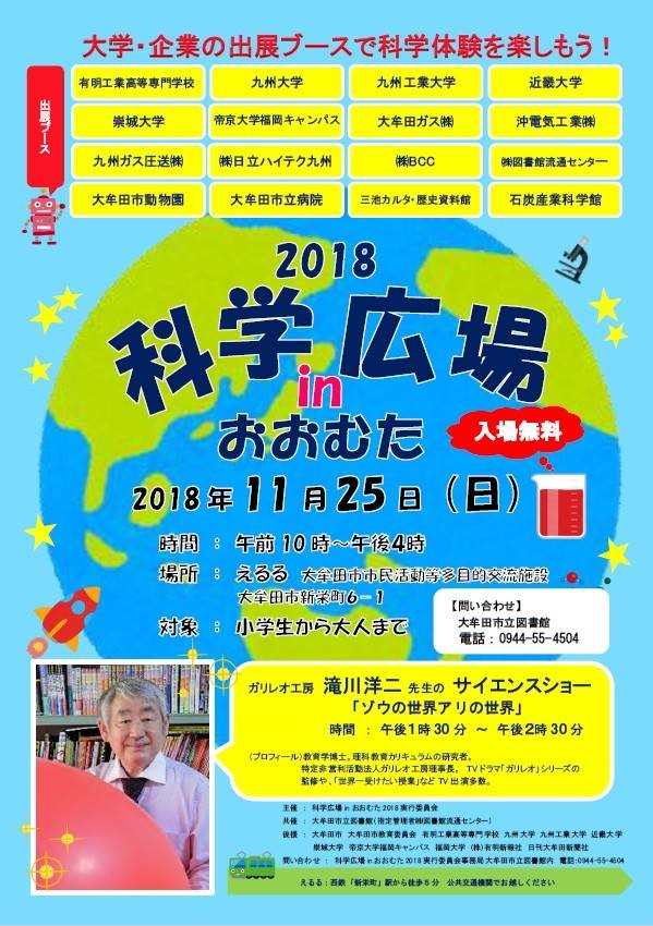 子どもたちに科学の不思議や楽しさを身近に感じてもらうことを目的に総合・体験型イベント「科学広場inおおむた2018」をえるるで開催します。